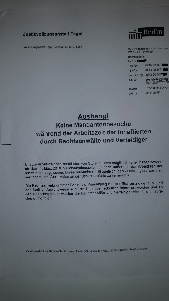 Dieses Merkblatt wäre ja lustig, wenn nicht zum Ausdruck gebracht werden würde, dass man in der JVA Tegel nicht mehr in der Lage ist, Rechtsanwälte abzufertigen. Dies dann mit dem Interesse eines Inhaftierten zu begründen …